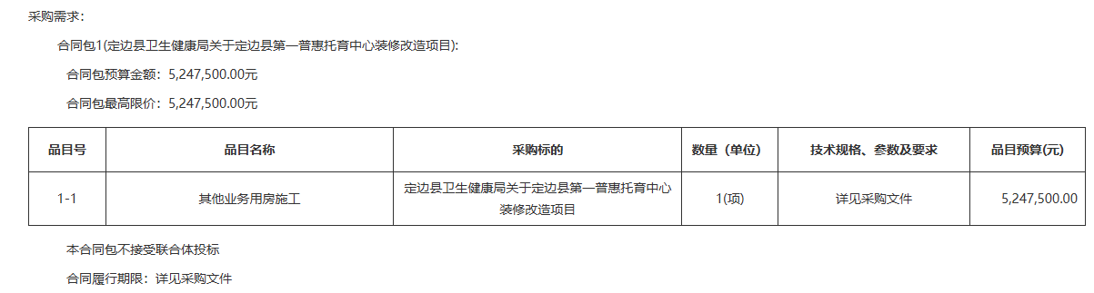 | 1-1 | 其他业务用房施工 | 定边县卫生健康局关于定边县第一普惠托育中心装修改造项目 | 1(项) | 详见采购文件 | 5,247,500.00 | |||||||||||||