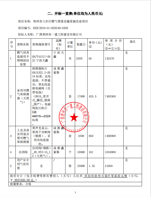 | 1 | 贺州市八步区燃气管道设施更新改造项目 | 家用可燃气体探测器(天然气) | 成都鑫豪斯 | 1批 | 7403500 | 详见附件 |